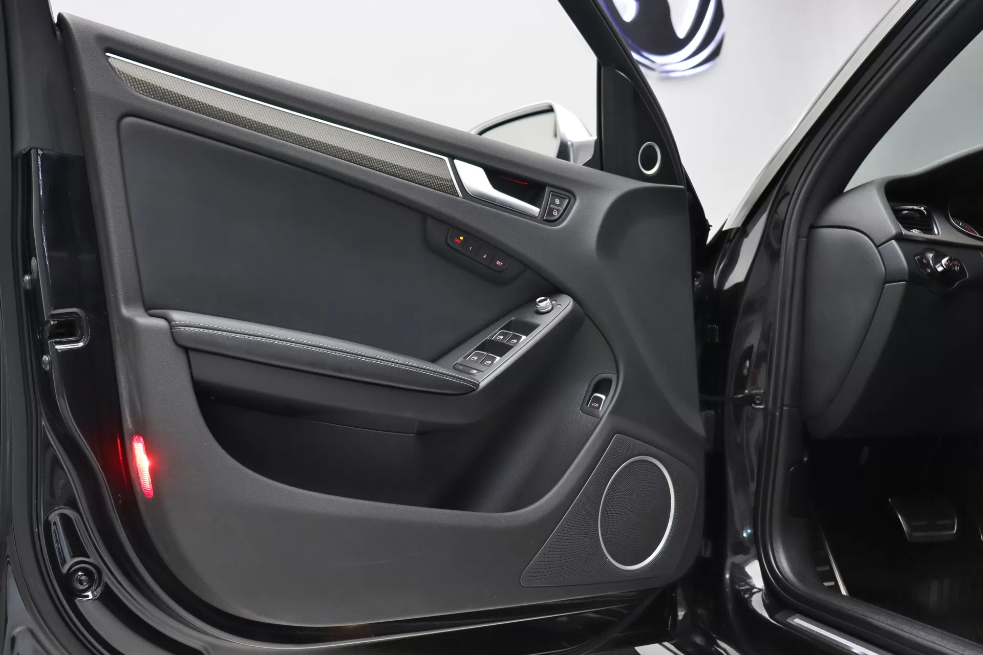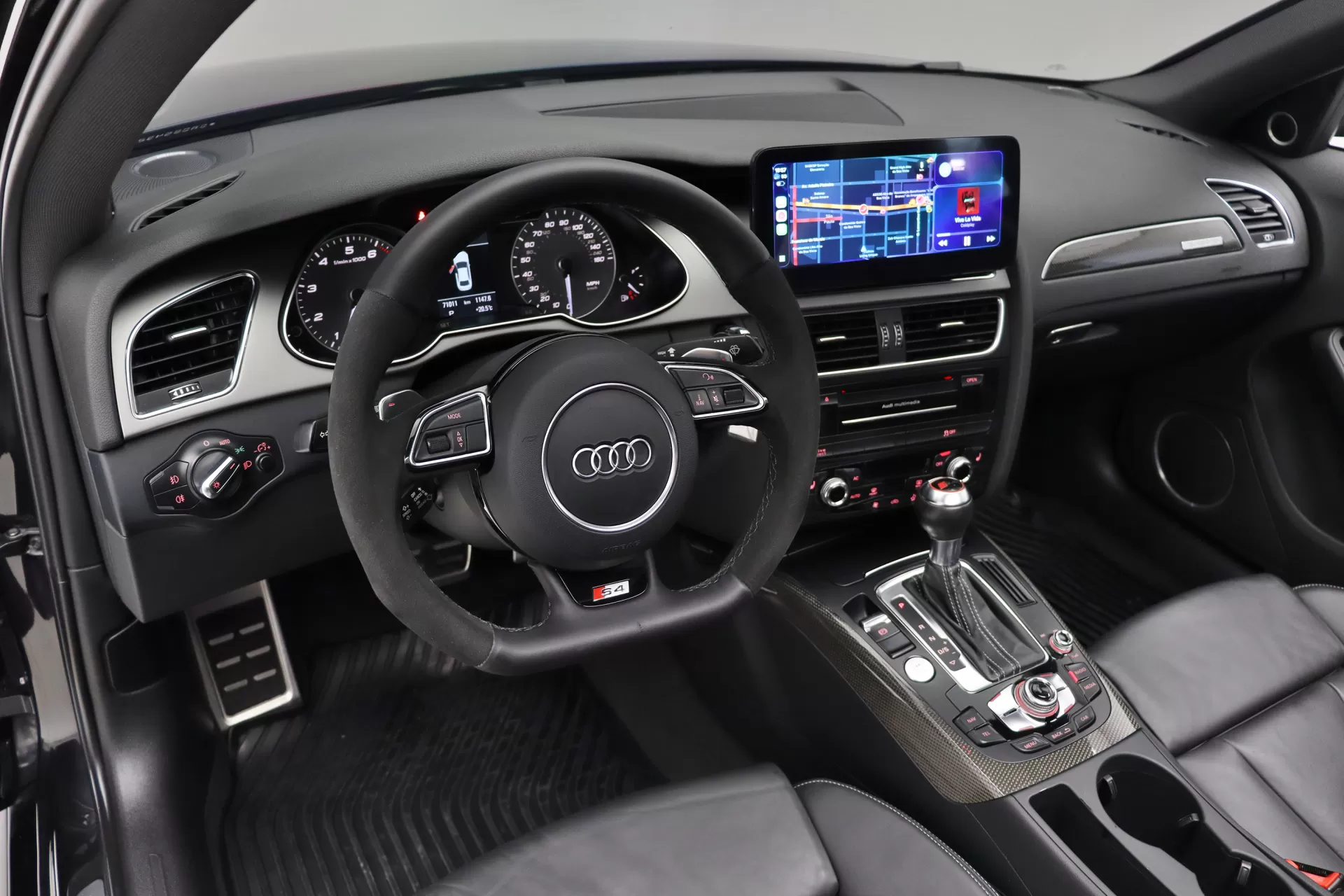 Android Auto e Apple CarPlay instalado, configurado na cor Preto com interior em Couro Preto, teto solar em vidro, volante em couro e Alcantara com paddle shifts, bancos de ajuste elétrico com memória e aquecimento, sistema de Som Bang & Olufsen, soleira S4 em alumínio escovado, tapetes em borracha, pedaleiras em alumínio, rodas aro 19’ em Prata, em exposição no nosso showroom.