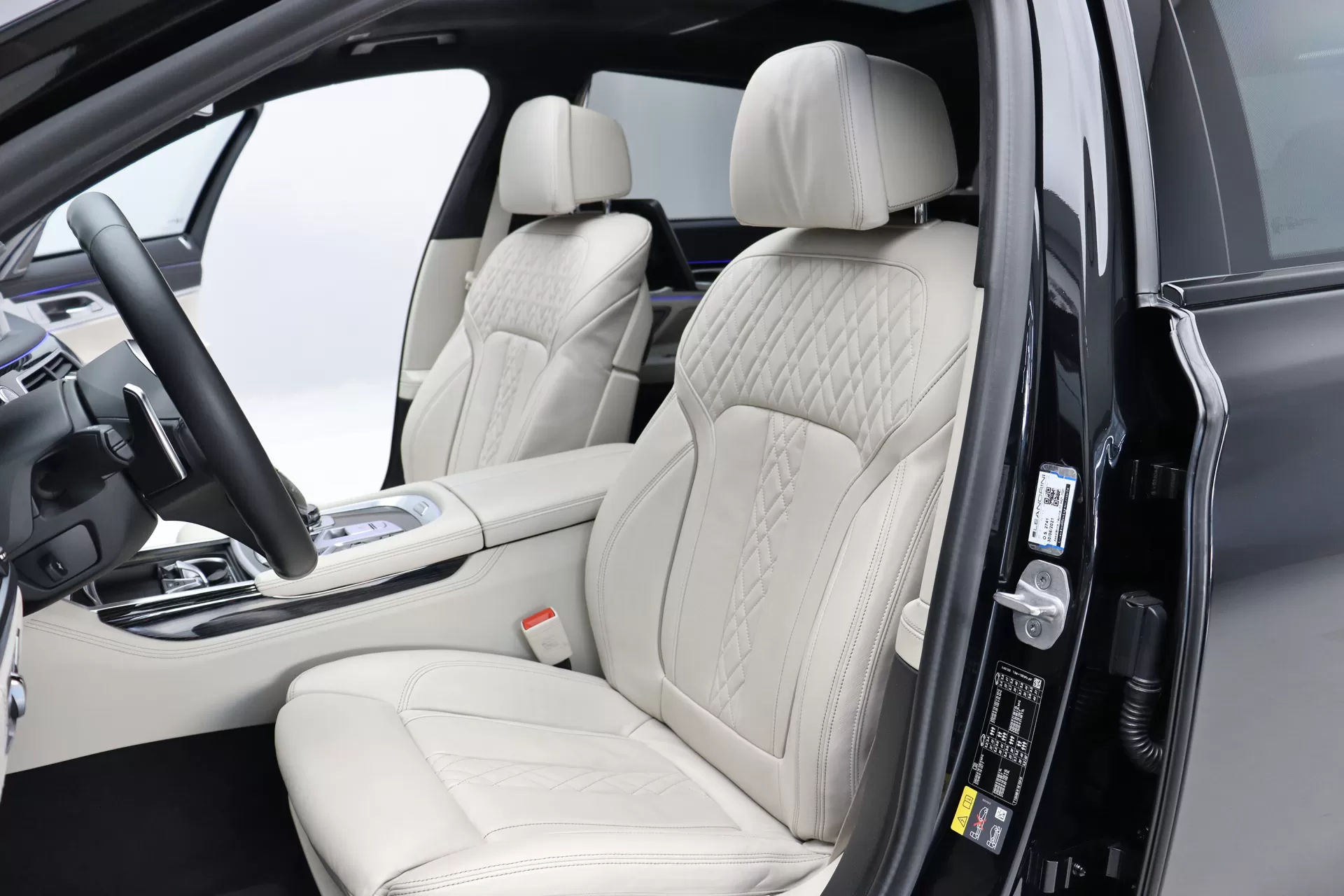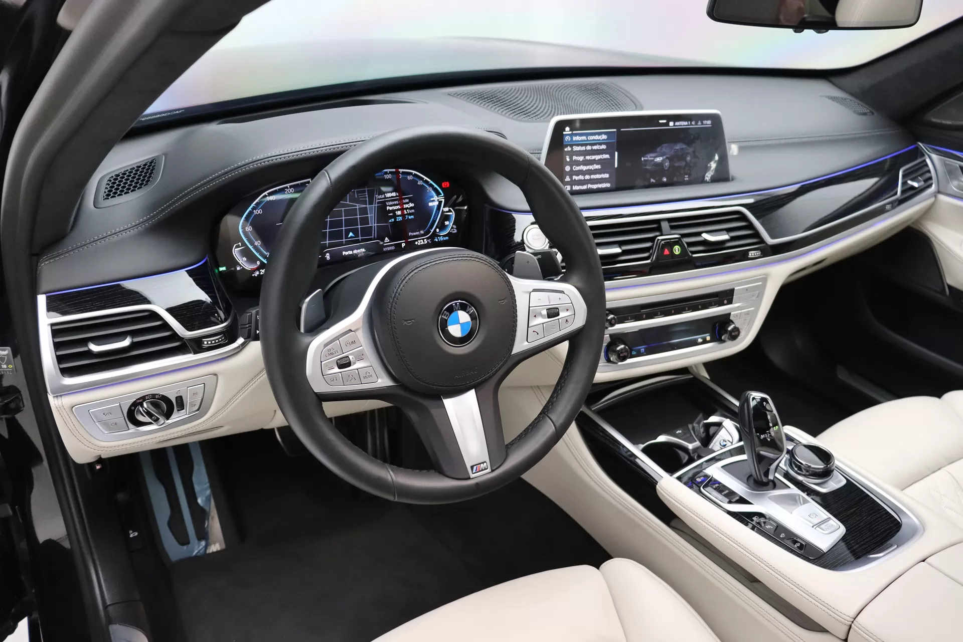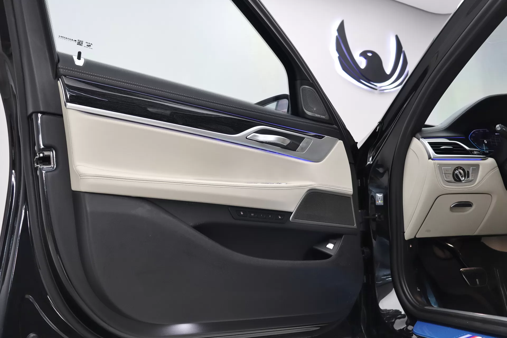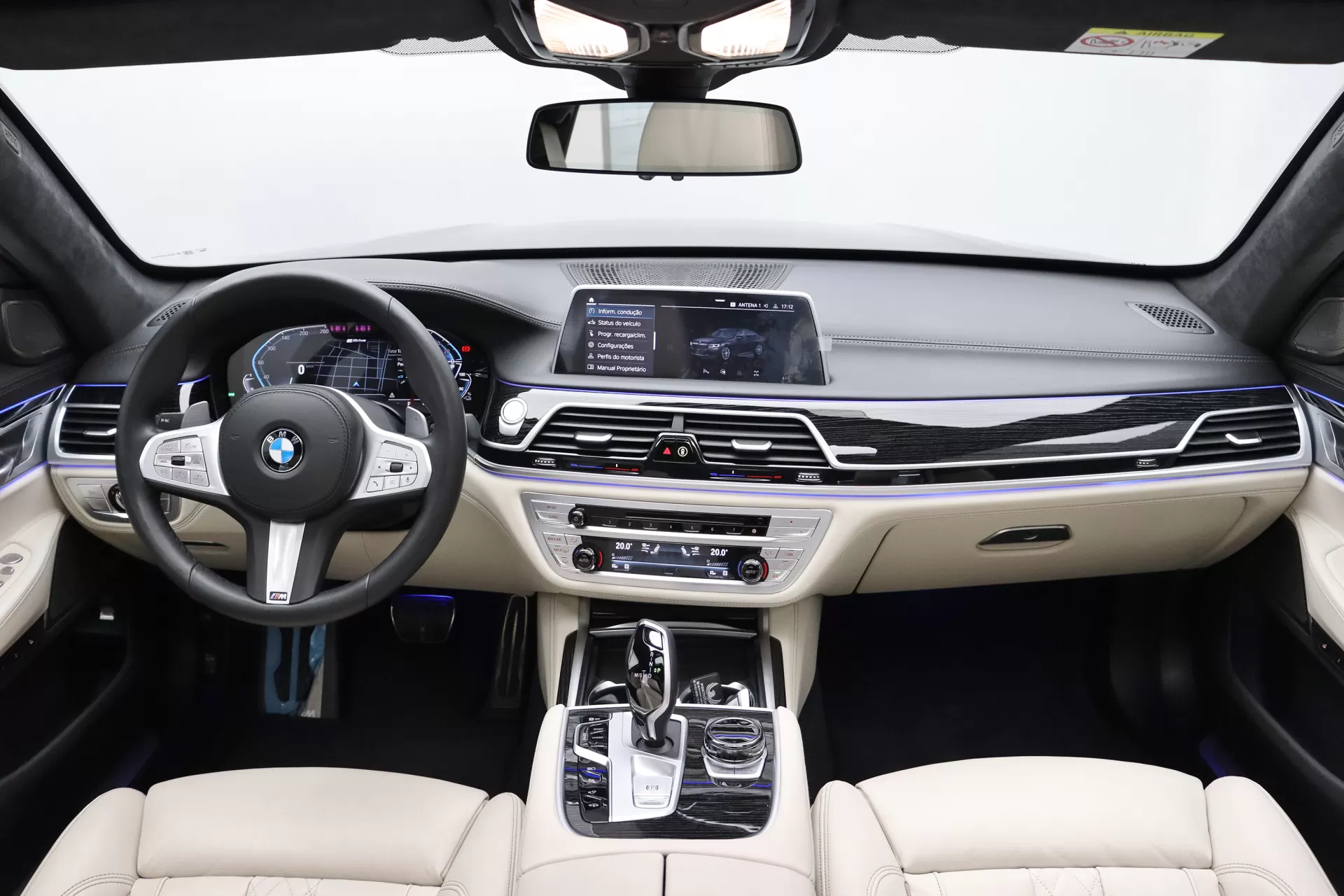 Blindagem nível III-A Leandrini com vidros AGP B33, teto solar panorâmico transparente e funcional, vidros dianteiros e traseiros funcionais, configurado na cor Preto Safira Metálico com interior em Couro Nappa Branco Marfim, volante M Sport com paddle shifts, bancos de ajuste elétrico com memória e massagem, Android Auto e Apple CarPlay, sistema de som Harman/Kardon, carregador de smartphone por indução, câmera 360º, Night Vision, iluminação ambiente, acabamento interno em madeira, cortinas e display de entretenimento para o banco traseiro com tablet, banco traseiro com massagem, head-up display, ajuste de altura do chassi, sucção de portas, rodas aro 20’ diamantadas, em exposição no nosso showroom.