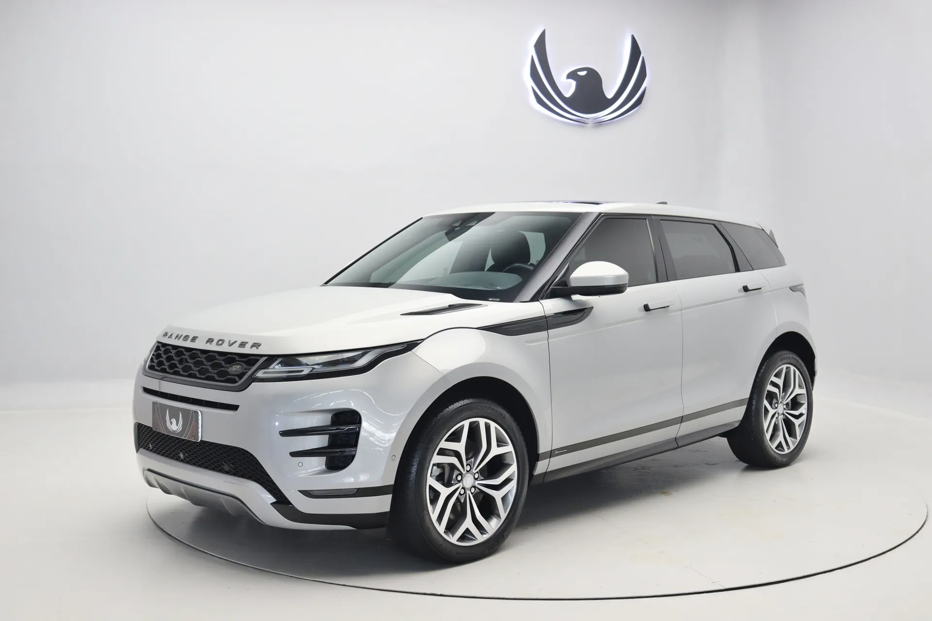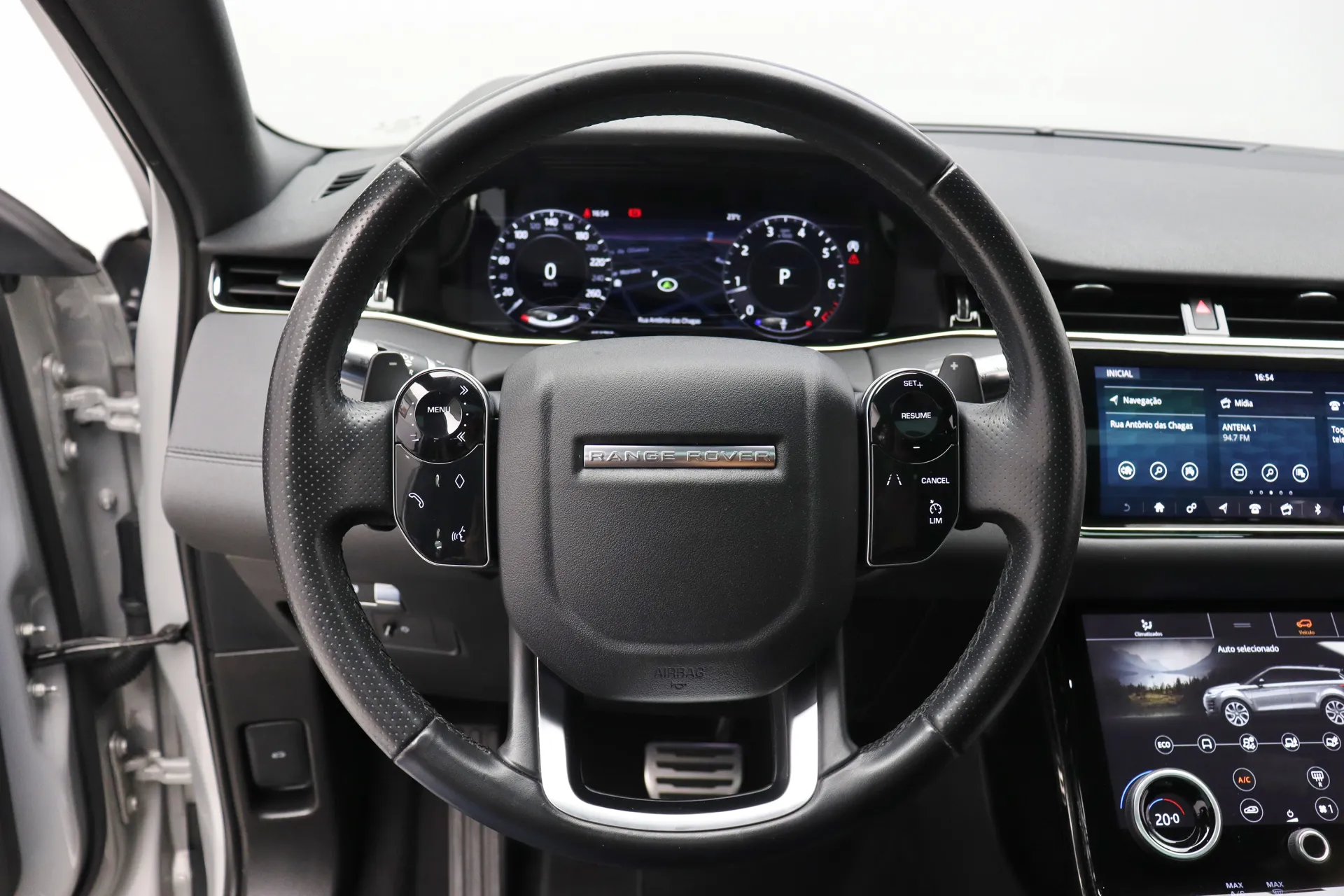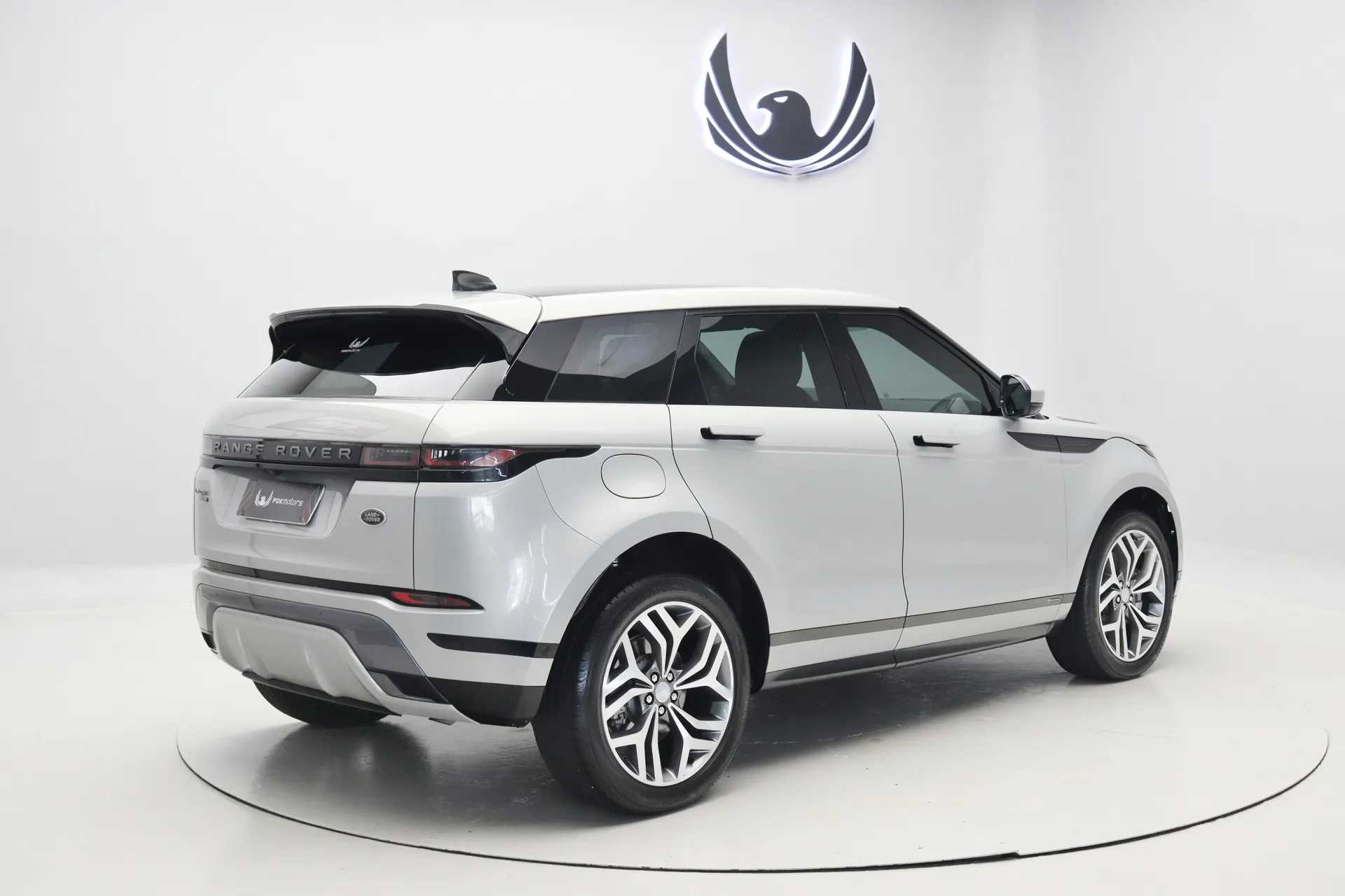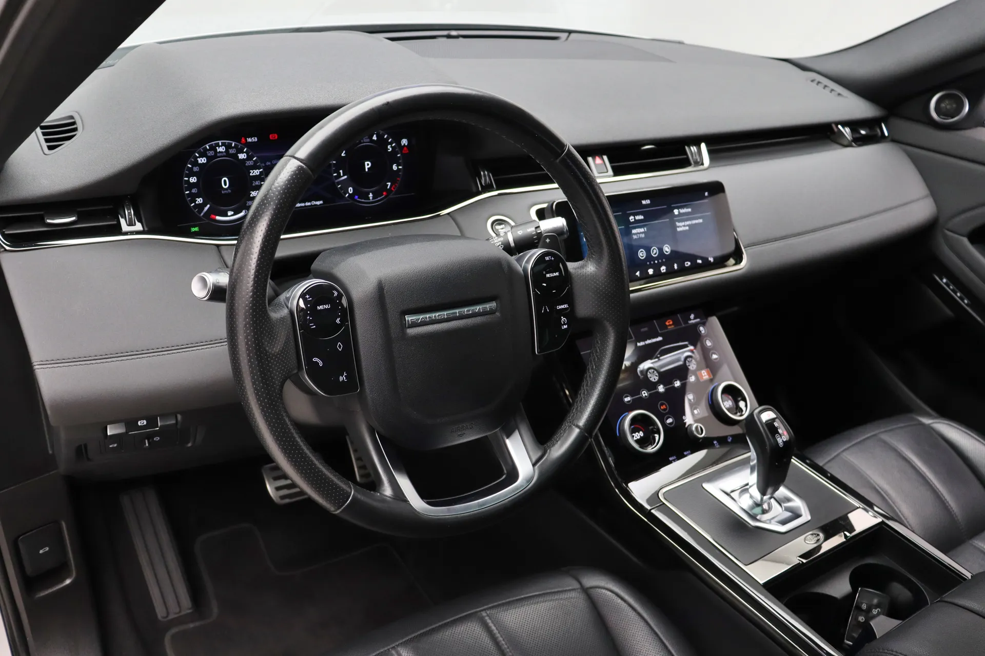 Configurado na cor Prata Seoul Perolado com interior em Couro Preto, volante multifuncional com paddle shifts, teto solar panorâmico fixo, bancos de ajuste elétrico com memória, sistema de som Meridian, Android Auto e Apple CarPlay, controle de cruzeiro Off-Road, assistente de estacionamento com câmera de ré, soleira R-Dynamic em alumínio, projeção de logo “Evoque” nas portas, Start & Stop, pedaleiras em alumínio, rodas aro 20’ diamantadas, em exposição no nosso showroom.
