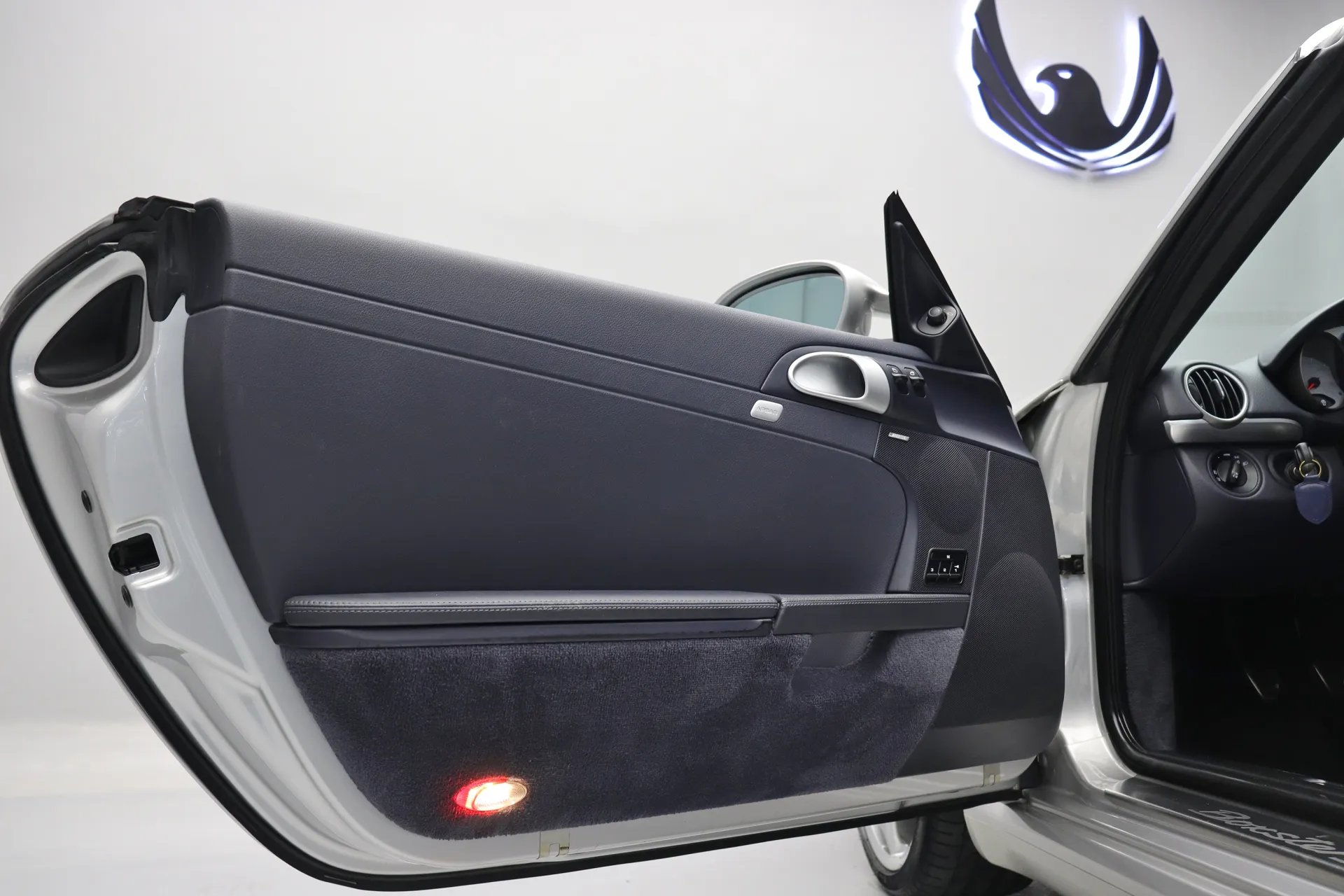 Câmbio manual de 6 marchas, configurado na cor Prata com interior em Couro Azul, capota em Azul, santo antônio em Prata, volante em couro Azul, bancos de 12 vias com memória, sistema de som Bose, Sport Chrono Package, cronômetro e conta-giros em Branco, soleira em alumínio escovado, modo Sport, controle de estabilidade PSM, suspensão esportiva, porta copos, aerofólio traseiro retrátil, ponteiras de escapamento em cromado, rodas aro 19’ em Prata, pinças de freio em vermelh, em exposição no nosso showroom.